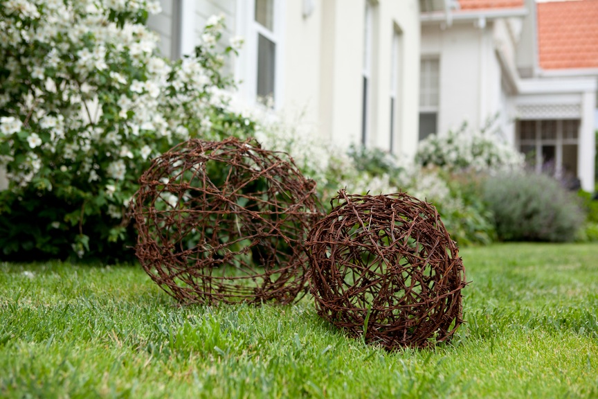 … aka ‘There will be no backyard cricket on my lawn, thanks very much’. Kirby Roper, Tatty Happell and Sally Wilson have found a nifty way to combine a shared creative bent with a passion for recycling – launching their Great Balls of Wire range of rusty wire items. Not all the pieces are designed as play equipment for the feral kid in Mad Max, there are also light fittings available in both cylindrical, round and egg shaped forms.