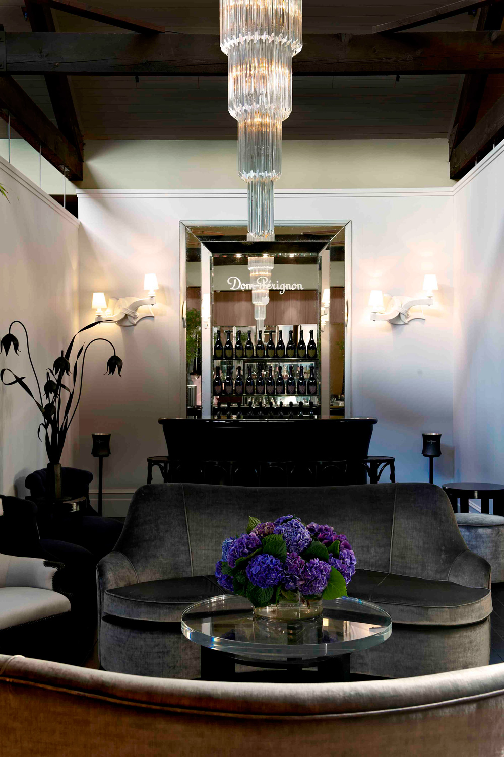 Never having worn a dress doesn’t preclude me, a male, from knowing who Collette Dinnigan is. One of the few international stars to come out of Australia, Dinnigan’s frocks have draped from the shoulders of Angelina Jolie, Halle Berry and Naomi Watts, as well as won her acclaim and a 15-year run on the catwalks of Paris. And like most of our top Aussie exports… she’s originally a New Zealander. To Dinnigan’s credit, for all her international acclaim the designer has brought attention to her roots (ahem, Australia that is) rather than trying to transcend them. Her latest collaboration has been to design the new Dom Perignon Lounge at Hemmesphere. It’s only the fourth in the world; the others designed by Marc Newson and Karl Lagerfeld — placing Dinnigan, and luxe Aussie hospitality, in good company. Having opened boutiques herself, the fashion designer is no stranger to interior design, and as one would expect paid particular attention to fabric choice. The chairs were sourced from antique dealer, The Country Trader, and covered in lilac and navy linen, while the custom-made sofas were covered in lilac velvet. Floral motifs feature in a black tulip iron feature from Chuck & Bob, who also provided circular lucite tops for the antique iron table bases, the wall lights, and mirror and shelving behind the bar, ageing the glass to suit. The wall colour was a custom mix of Haze with black and white, created by Collette and Tory Collison with Porter’s Paints. Porter’s also covers the floorboards and urns. The feature artwork, commissioned by Dinnigan, is Redleaf II by Tim Maguire. Justin Hemmes said about the revamp, “The Dom Pérignon Lounge now has an old-fashioned, glamorous feel, yet is incred- ibly warm and inviting. I am proud that Hemmesphere has been chosen to showcase the result of two luxury brands — Dom Pérignon and Collette Dinnigan.”