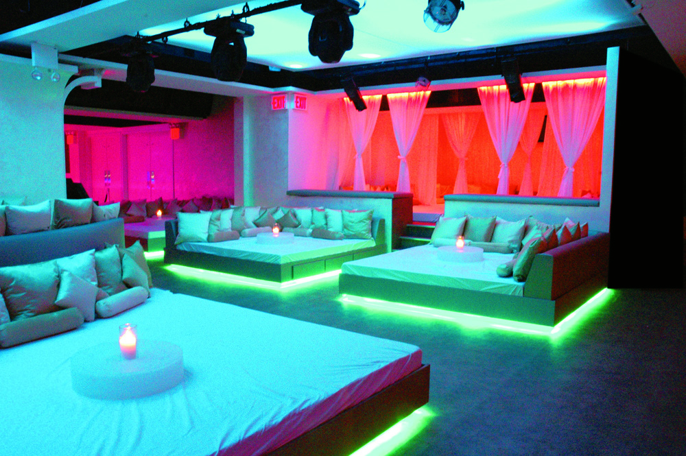 Upon entering Duvet, patrons will at once find themselves amazed at the sheer size (over 20,000 square feet) and elegance of the space. On the first floor, Venetian paint embossed with silver leaf adorns the walls, creating an upscale, glamorous vibe. The 27-metre frosted-glass ‘Ice Bar’ — so named for its resemblance to melting ice — is Duvet’s full-service, 35-seat bar featuring unique signature cocktails. I can think of a few that might be appropriate, such as Kick the Dog Off, Wet Patch, and of course the traditional, yet slightly dull, Between the Sheets.