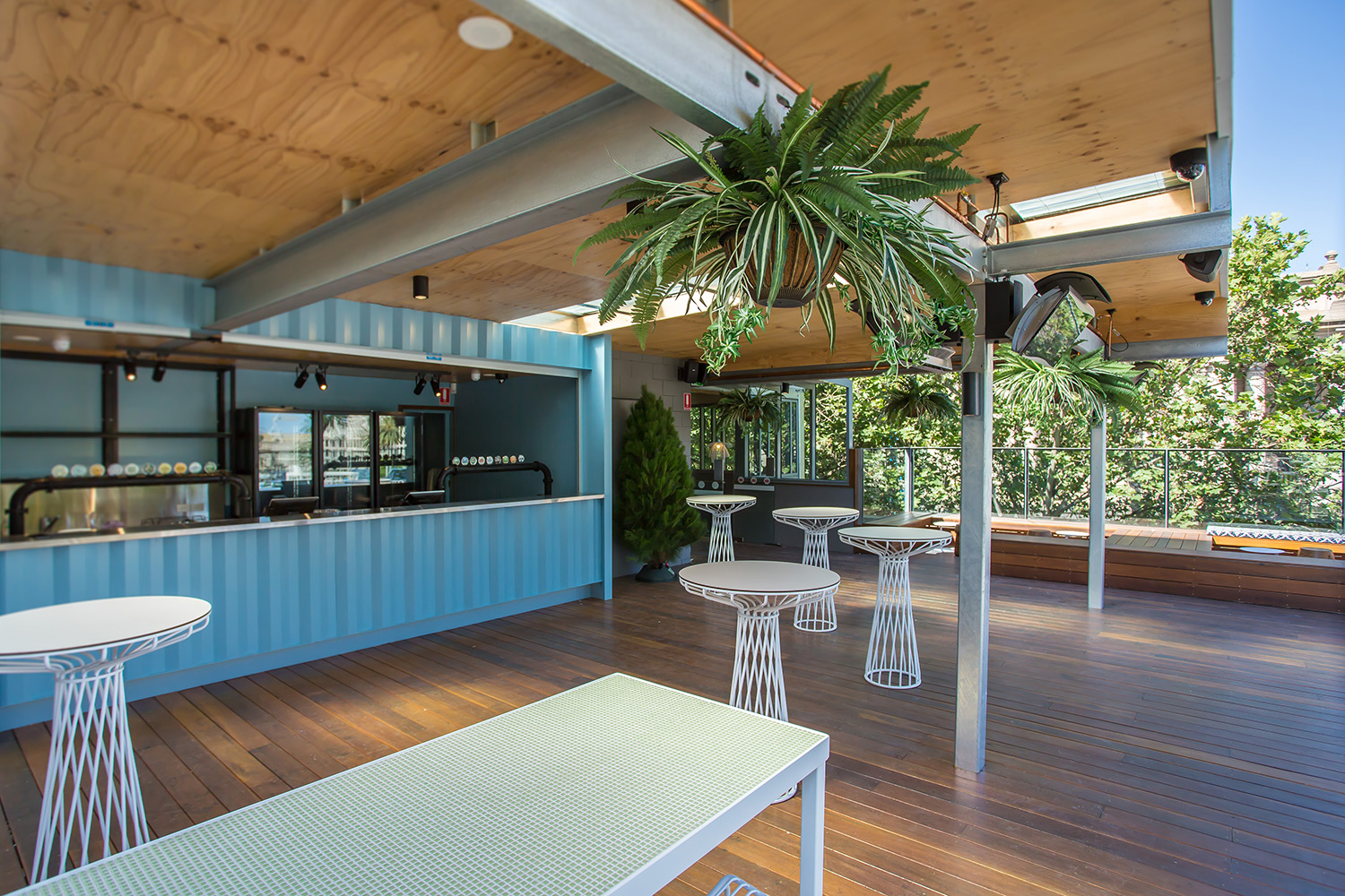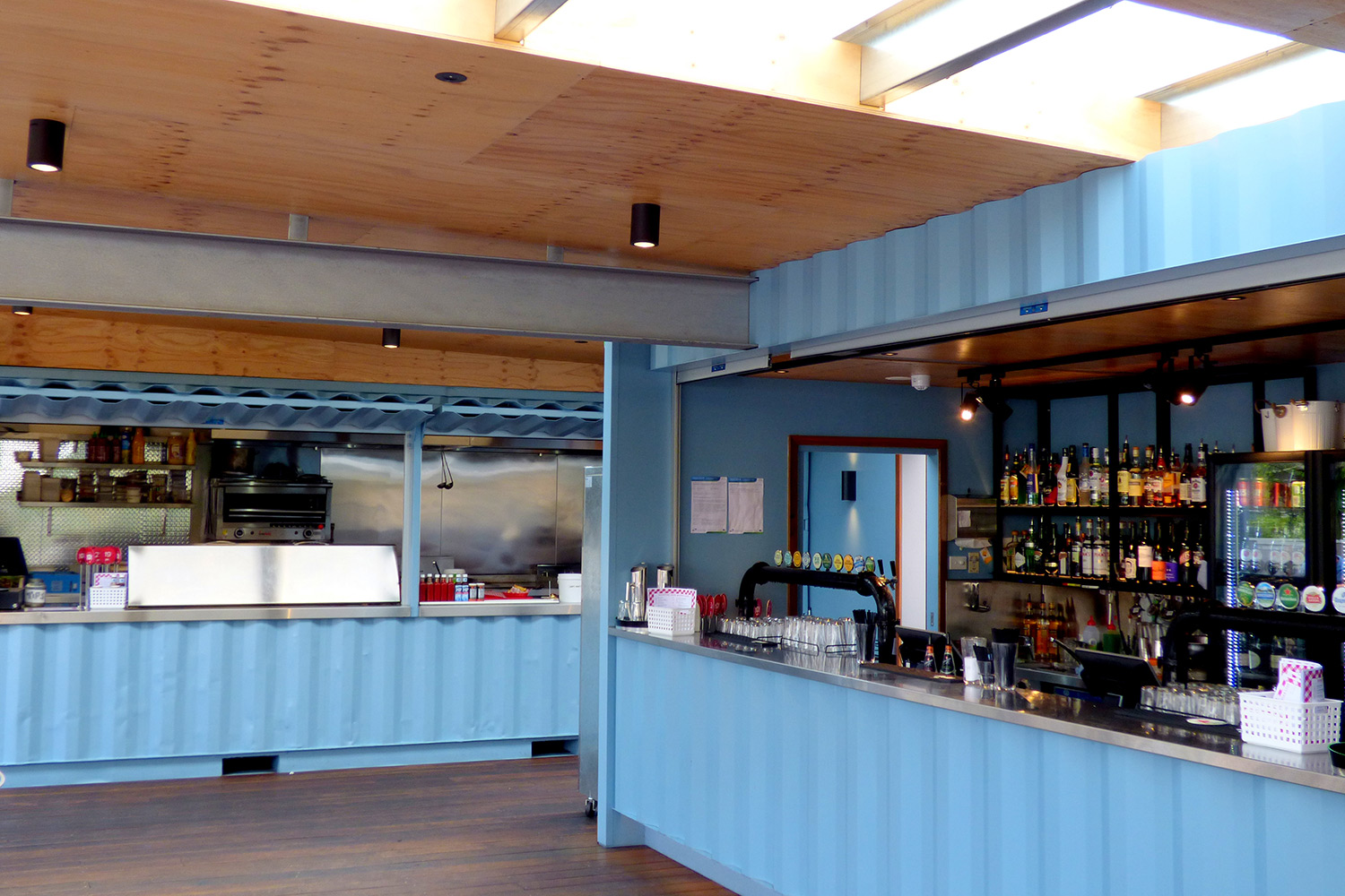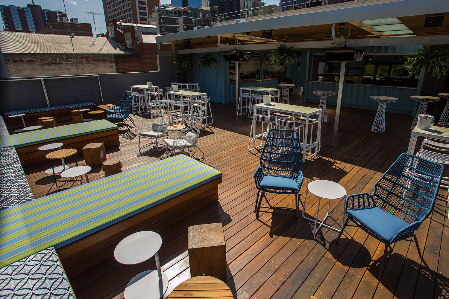The rooftop provides bar snacks and a range of tap beer, served from repurposed shipping containers — evoking an exciting, hawker-style environment.