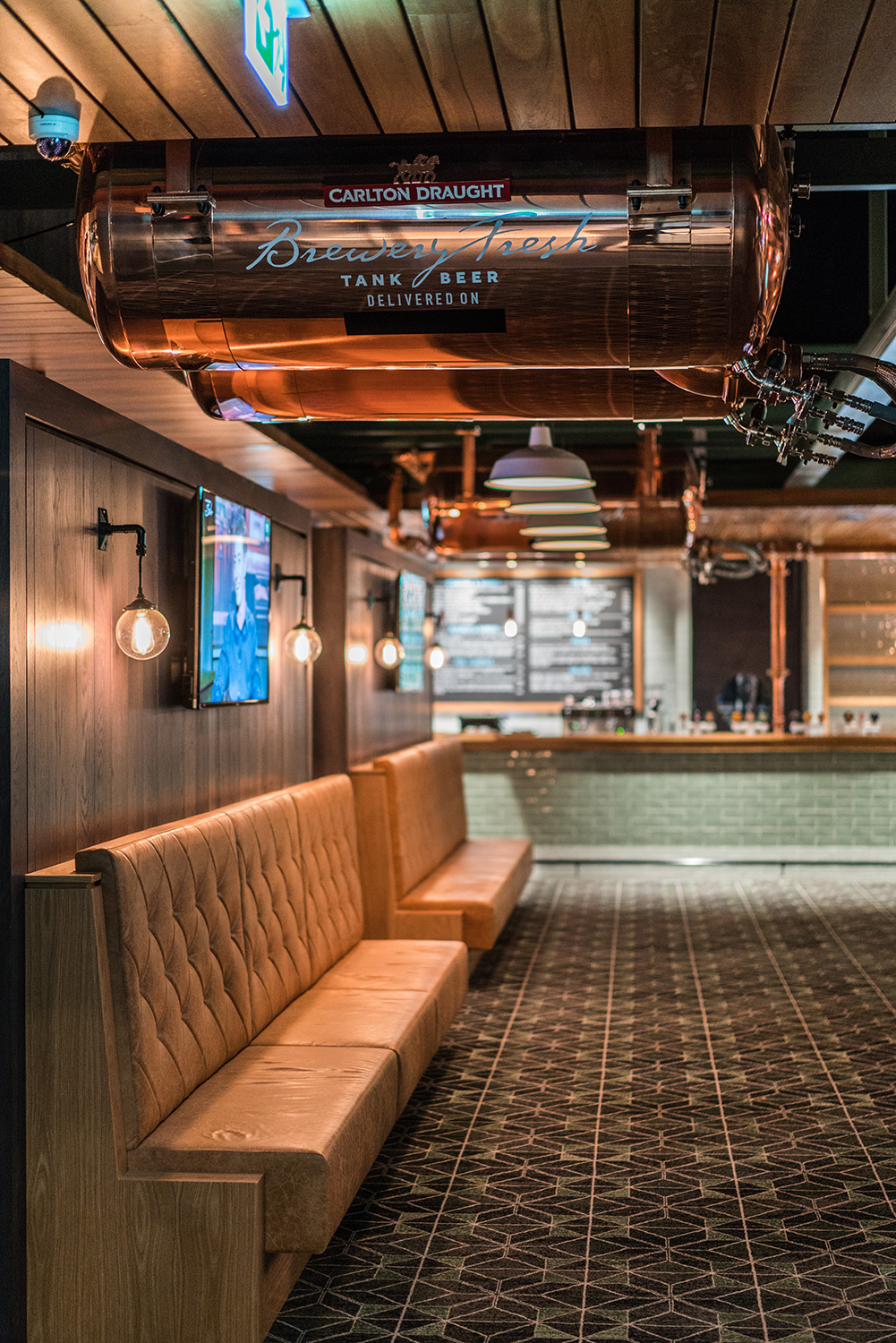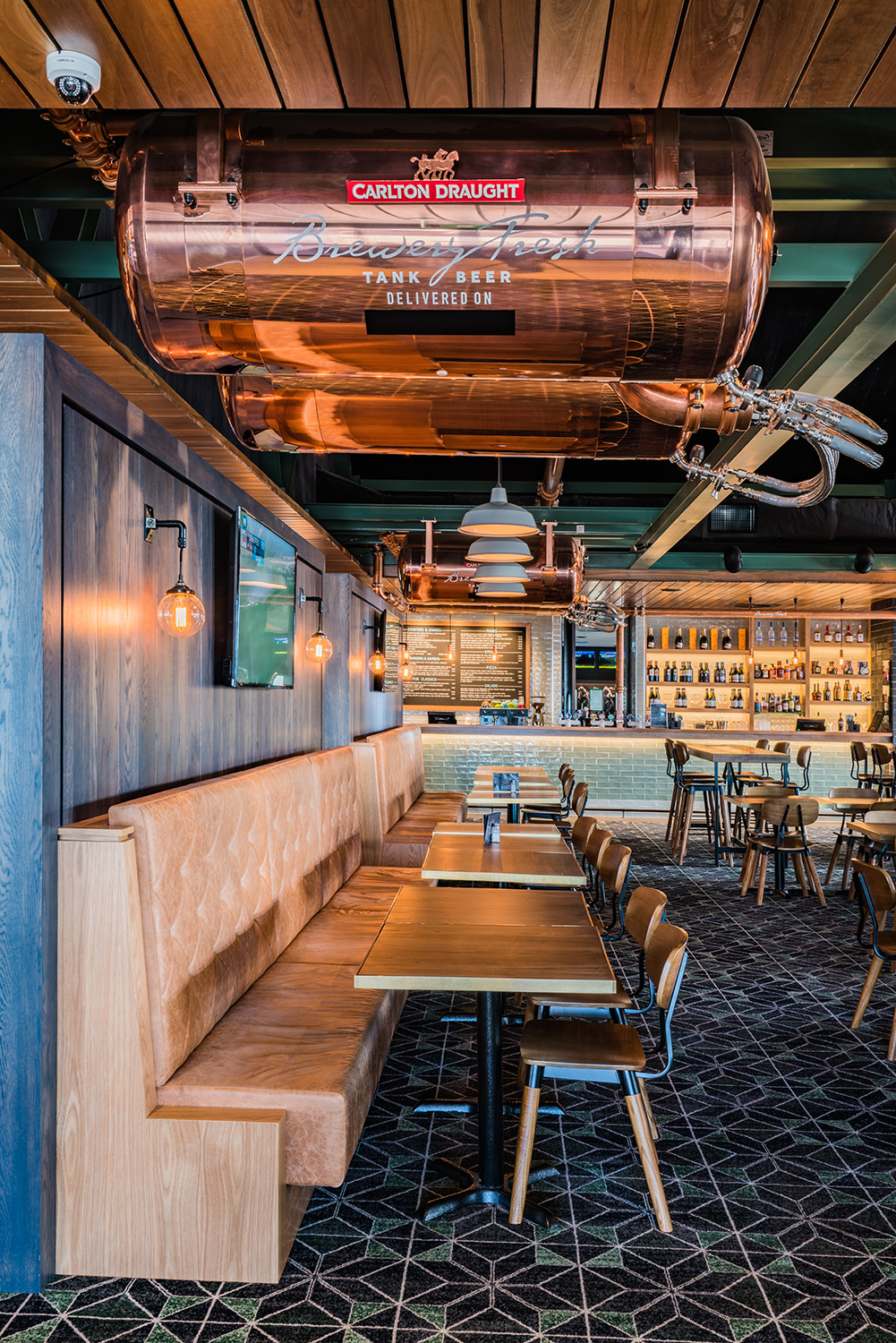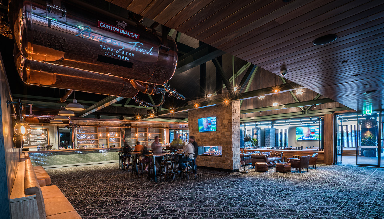 On the opposite side of the building, a family-friendly entrance marches straight into the cavernous, shared bistro and lounge bar area. Carlton Fresh beer tanks greet you at the door overhead, directing your vision to the vaulted ceiling with the contrasting colour of the beams providing some definition and perspective.