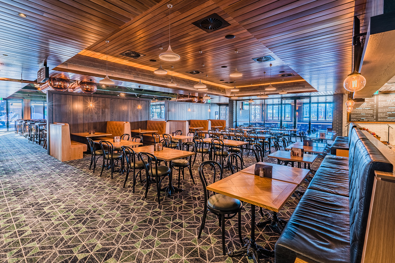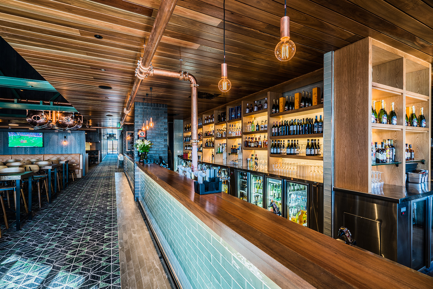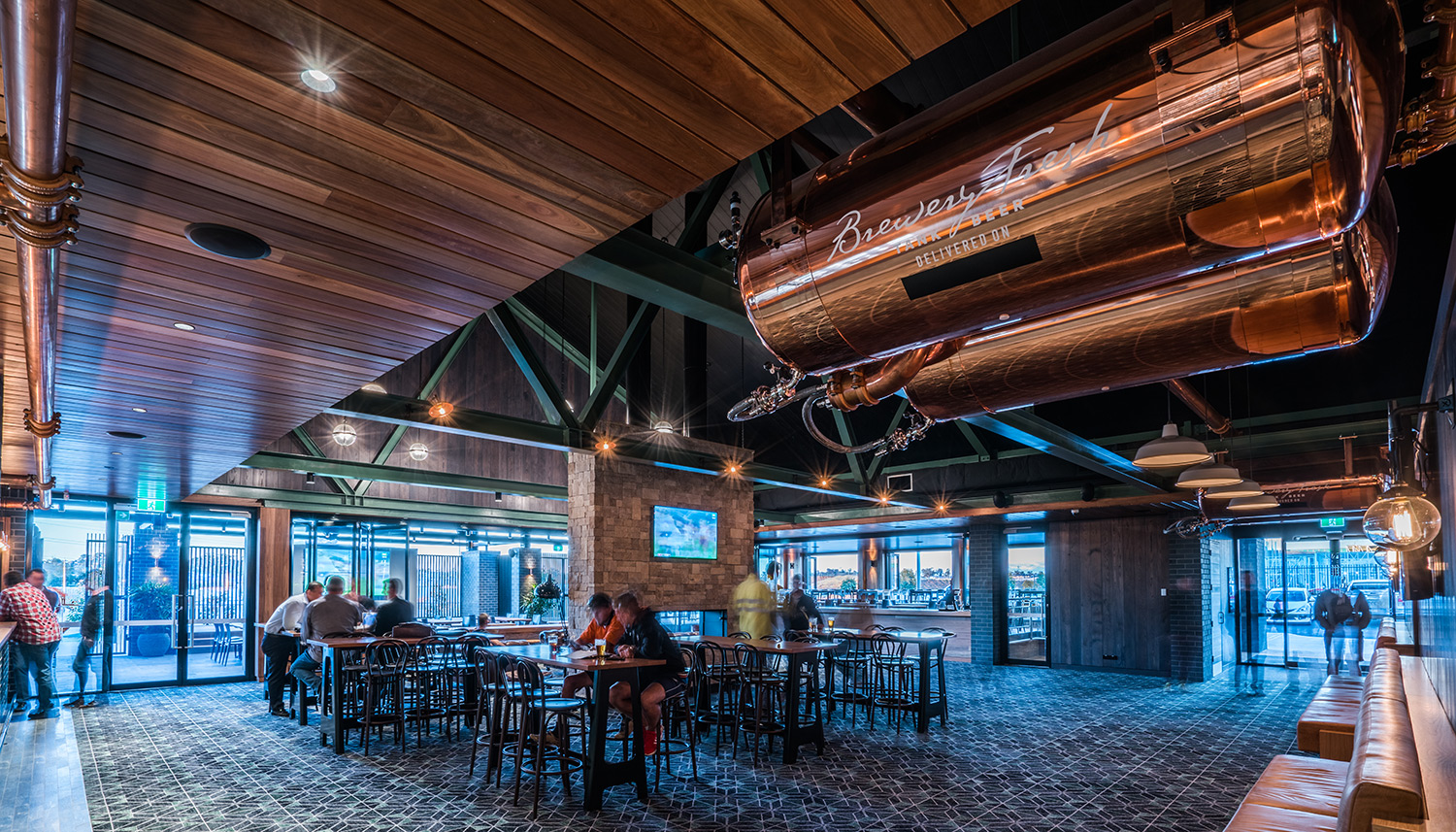 On the opposite side of the building, a family-friendly entrance marches straight into the cavernous, shared bistro and lounge bar area. Carlton Fresh beer tanks greet you at the door overhead, directing your vision to the vaulted ceiling with the contrasting colour of the beams providing some definition and perspective.