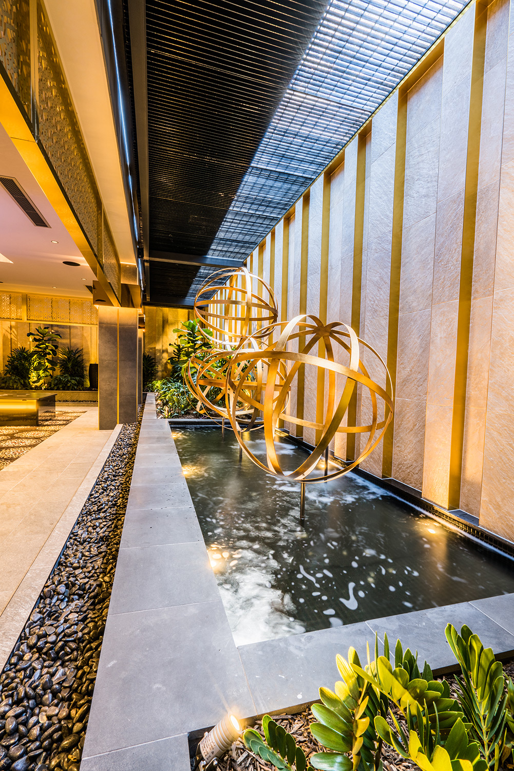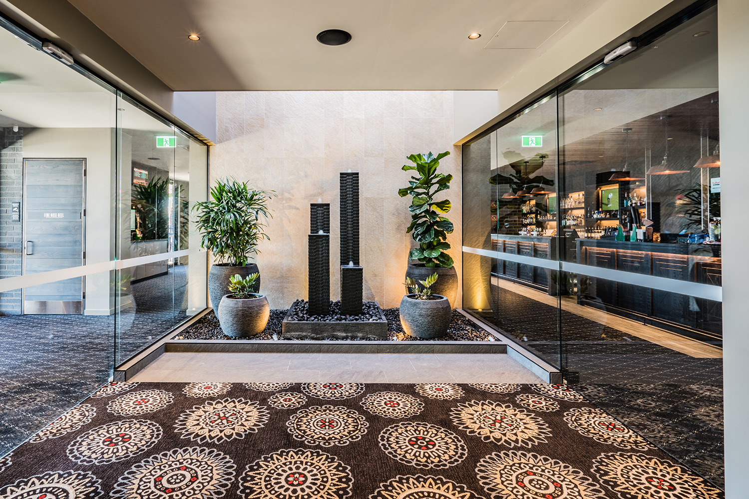 Two principal entrances access the two key halves of the hotels. The ‘restricted’ side is more opulent with a water feature and access to the TAB sports bar and the Paul Kelly-designed gaming room.