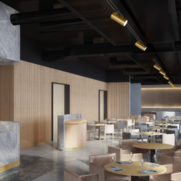 A soft colour palette of natural timber is contrasted with black accent walls, highlighting the light and shade design principles which are present throughout the hotel.