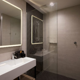 Each bathroom features a custom resin formed basin with metal accents carrying through into the vanity and back-lit illuminated mirror design. Generous walk-in showers feature a slate grey herringbone tile. All hotel rooms will encompass Novotel brand identifiers including the global Live N’ Dream bedding and fair trade bathroom amenities.