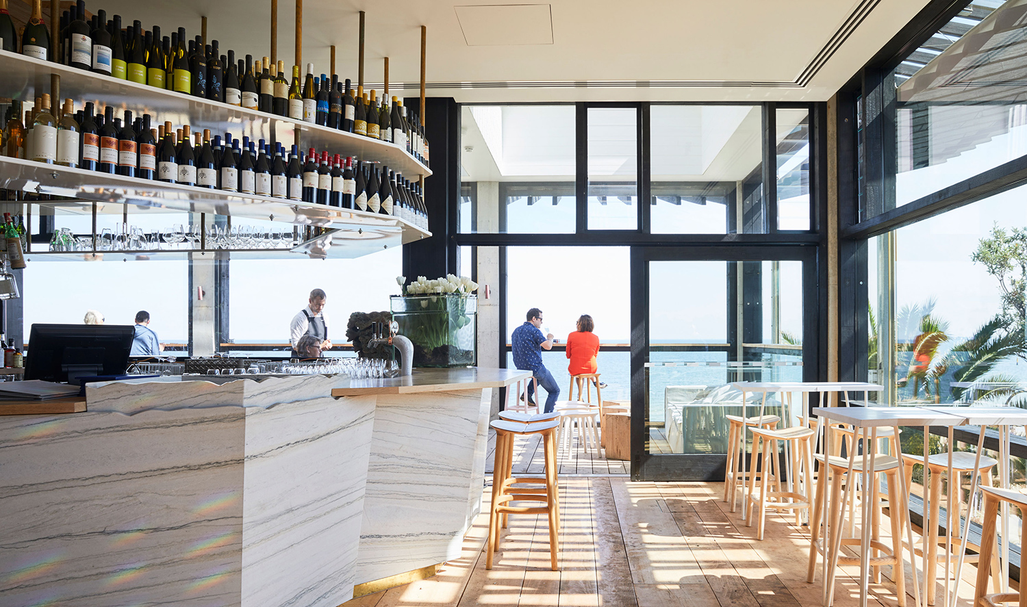 Stokehouse City has since been sold. It was briefly turned into Cut Bar & Grill, and is now the Alfred Place Melbourne events space run by Rockpool Dining Group. The sale allowed van Haandel to focus on getting the original Stokehouse back on its feet. The striking new building was designed by Robert Simeoni Architects and, as before, is split over two levels. This time though, the second-storey restaurant is propped up on pylons to leave a gap between it and the ground floor casual eatery, Pontoon. It’s a completely different approach to the beach pavilion. Rather than the simple weatherboard shack, which Simeoni modernised when he built the Seaford Life Saving Club, this version is more like a multi-million dollar modernist holiday home poking out of the sand dunes along the coast.