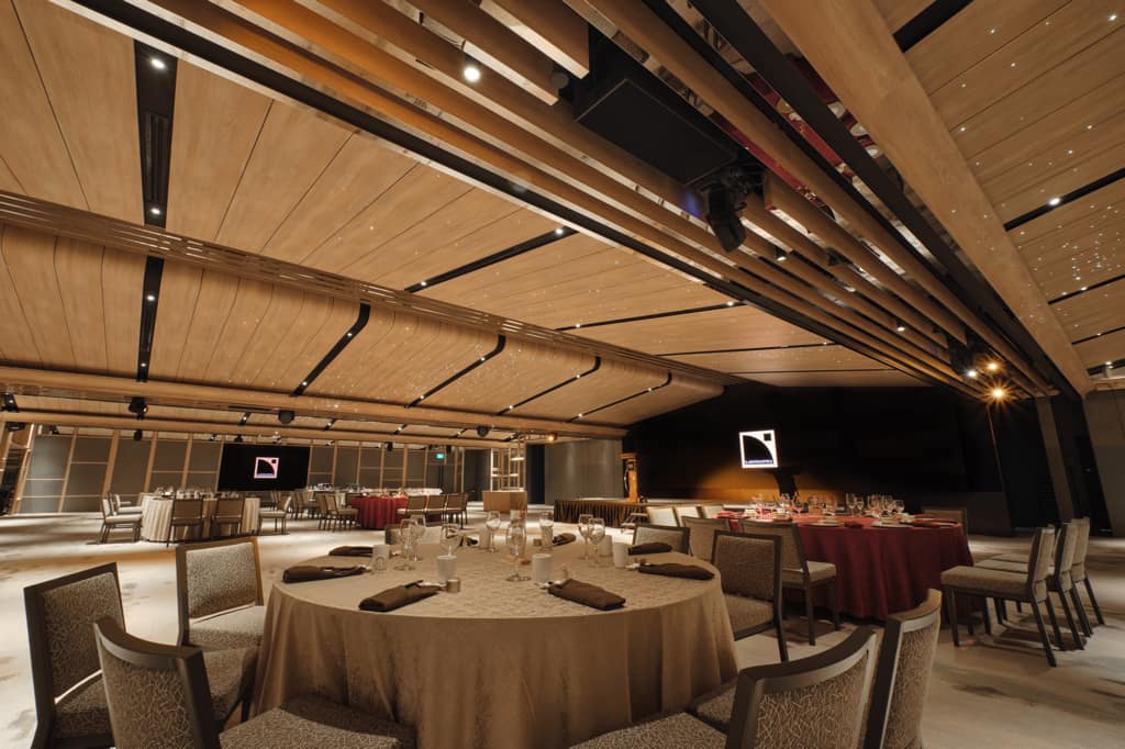 The 767 square-metre ballroom hosts wedding banquets and corporate dining events and can also be partitioned into three separate rooms for corporate seminars. Acoustic and audio-visual consultants CCW Associates were tasked with the technical specifications of the Garden Ballroom. Concealing all speakers at their installation points within the elegant interior design was an essential requirement.