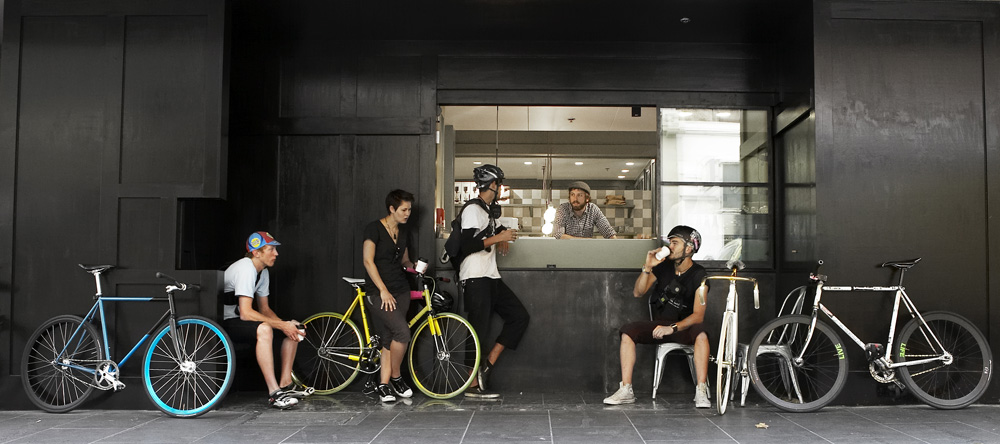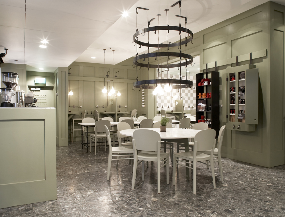 All the while connecting how they taste with what they drink, which they can take to the next level by ordering off the raw food menu to enhance the coffee flavours even further. It’s all in the name of educating people to treat coffee as an experience instead of a fix. There’s also a retail element, and because he’s a realist there’s a coffee window to the street that bypasses the lab- coats for a quick morning fix for guys on fixies. Designer Hecker Guthrie has brought a scientific attention to detail to the Sensory Lab. Loads of drab green and wire glass cabinetry, pared with white tiles and plenty of light creating a laboratory aesthestic that draws the line before clinical with plenty of noticeably human touches. [Photos: Thom Rigney]