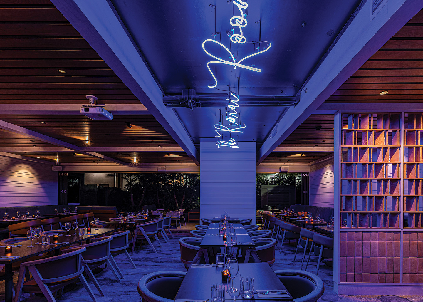 “It’s very comfortable to the eye,” according to Paul Kelly. “It allows the people in the space to shine as opposed to the venue shining. That approach is a little more unique to the Gold Coast. You’ve spent the day on the beach, you’re full of vitamin D and you want a bar or restaurant that makes you look as great as you feel. This really informed our colour palette and our lighting choices — the peach tones and the colour temperature of the lighting. People in the venue look their best.”