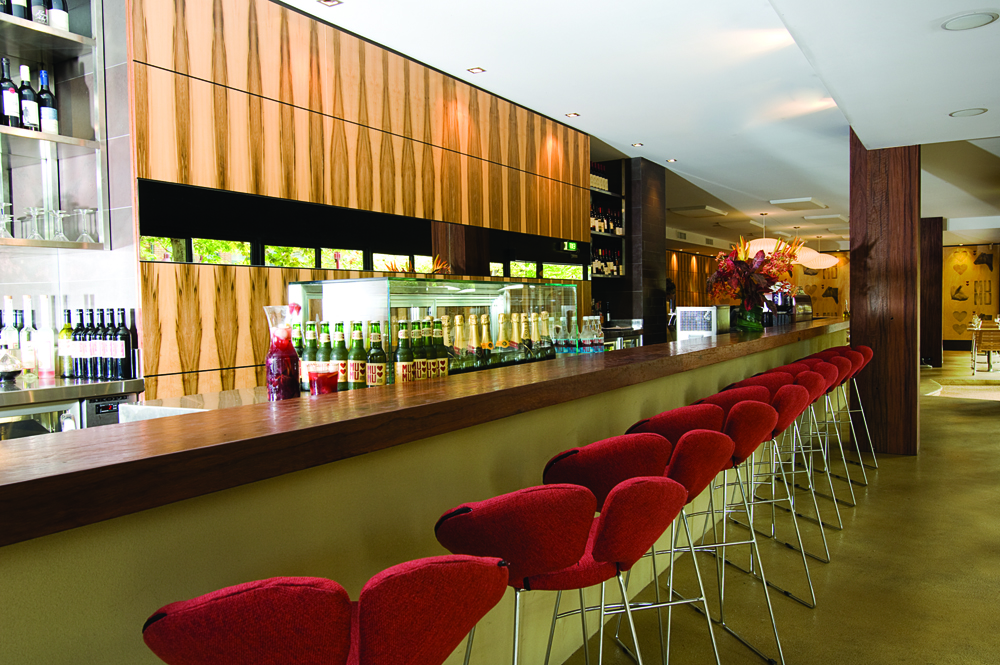As the name suggests it was not to be taken too seriously, hence the quirky wall art with the piggies, moo-cows and hearts. The branding and graphics were all developed alongside the interiors, helping to bring a cohesive look and feel.Rrecycled grey iron bark was used for the columns, bar top and outdoor tables, there’s Tasmanian blackhearted sassafras veneer panels in the dining area and bar, and some South American chocolate-coloured slate. All the materials are used in their most simple form — fresh, unaffected. Three large George Nelson Saucer pendant lights hover gracefully over the dining room — their yellowed parchment shades contrasting with the chocolate and timber tones of the walls.The 13m-long bar is adjacent to the dining room and its orientation creates a feeling of separation from the open plan dining room. While the same materials are used, the bar has a sleeker more dramatic feel. A cluster of bar stools, that resemble luscious red lips upholstered in a deep red woven wool, run along half the length of the bar with the solid recycled timber bar top continuing the full length, connecting the two spaces at the restaurant’s entry. A custom-made refrigerated display sits as a counterpoint to the timber top and allows for a tapas-style selection of cured meats and nibblies to be tasted and enjoyed whilst sitting in the bar area. A series of horizontal mirrors dissect the sassafras veneer panels creating depth and a reflection of the outdoor dining area inside the bar.