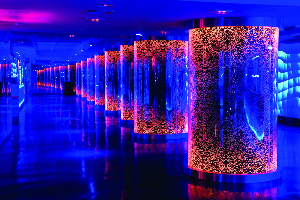Cylindrical columns arranged along the floor are dressed with floral engravings which also change colour, while background mirrors appear to double the space.