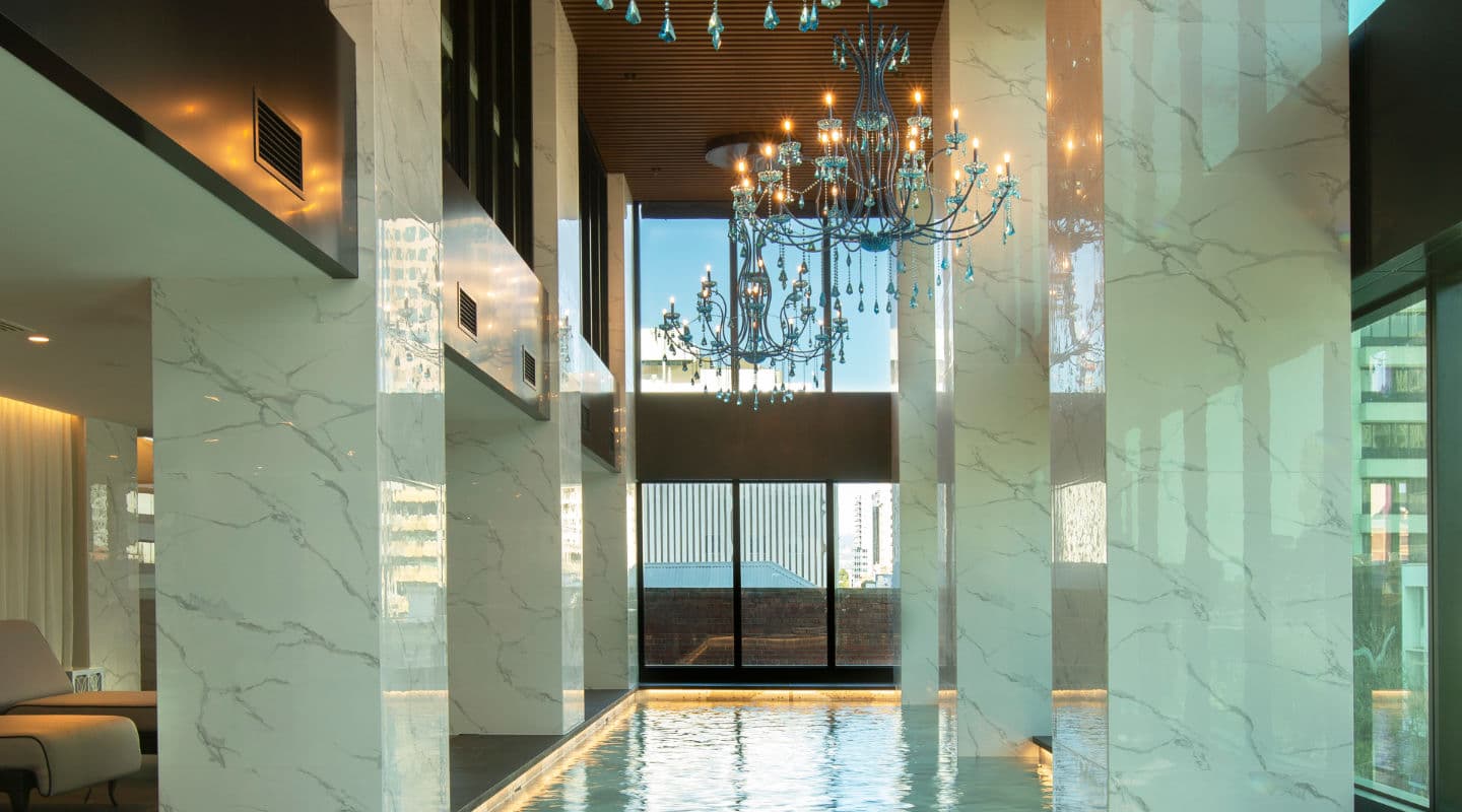 An original piece by Australian fine-art photographer, Alexia Sinclair, titled Field of Dreams, will form the centrepiece of the hotel lobby and segments of this historic French-inspired artwork will appear on lightboxes to illuminate the entire porte cochere ceiling, acting as a bewitching teaser of what’s inside. In the lobby, a striking flowing red wine-inspired chandelier has been suspended, representing the flow of wine and the shape of the nearby Torrens River, to reflect two of the most appealing aspects of destination South Australia.