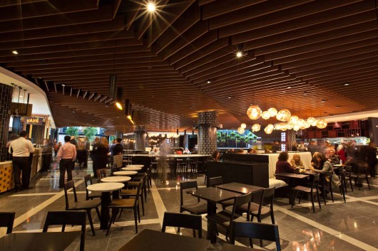 Designed by collaboration between blackmilk interior design and Walker Corporation, The Lunch Room looks like a restaurant, but is also the fashionable new home for Think Asia (Asian and Thai), Papadam (Indian cuisine), Nashi (Sandwiches), Rhumbas (Rolls), Edamama (Salad Bar), Salsaʼs (Tex Mex Grill), Sobo Japanese, Big Italiano, Harvest Juice Bar and Hudsons, a specialty coffee shop.