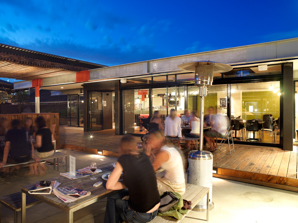 A cigarette, beer and a band still go hand in hand for many punters at the Corner Hotel — a bastion of live rock’n’roll in Melbourne. Rather than bucking the institution, the Corner, with the help of architects, Six Degrees, transformed its rooftop into a smart dining area and beer garden: smokers won’t miss a beat. The initial impetus behind looking upstairs was the ability to serve more meals in a larger dining area, with pre-empting the July 1st smoking laws firmly in the back of the mind. The band room has been non-smoking since the upstairs completion in December 2005. An attitude change was important. Being a smoker himself, music coordinator, Ben Thompson, thought there would be problems quelling the notion of smoking while watching a band, but amazingly there’s not been a single complaint. The upstairs area is having a dual effect of opening up a whole new demographic of non-music patrons; and sparking a resurgence of 40-plus punters coming out of the woodwork, filling out blues and jazz shows in the smoke-free band room. And a full dining crowd upstairs now often complements capacity shows of 800 downstairs.The Corner owners approached Six Degrees after working with them on the Phoenix Bar. it was important for the deck design to not alienate the rusted-on clientele with something incongruous. But it needed to be a pleasant dining area that would attract its own clientele. The resulting space has won the hearts of the Richmond summer drinking crowd and year-round punters alike. The open plan zone features the heavy use of recycled items, making it feel diverse and eclectic. Far from looking like some Johnny-come-lately add-on, the outdoor area feels like it’s always been there… much like the Corner itself really. And Winter months won’t freeze the, ahem… butts off the furtive smoker, with heating installed under the ’30s-style railway awnings to warm the parts a cigarette can’t reach.