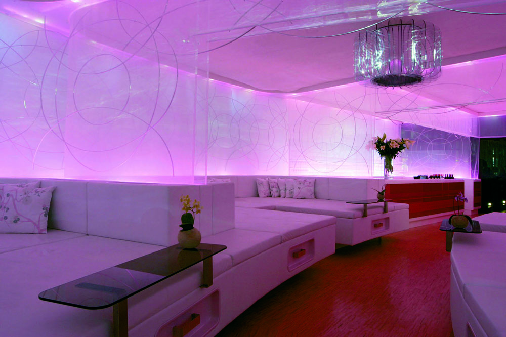A striking feature of the club’s interior design is a 100m long white membrane wall enclosing the main floor. Here some comfortable ‘cocoons’ — soft padded seats — offer some temporary relief from the avant-garde techno/house that Sven is so fond of. The structure of the membrane is livened up with the help of computer-animated projections: in total, 23 projectors are used in the club. Much of 3deluxe’s design inspiration came from biological models. These are reflected in both the three-dimensional structuring and the variety of forms in the interior.