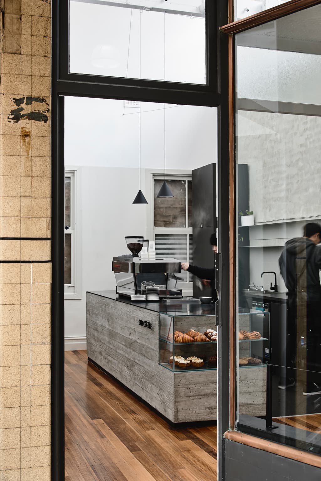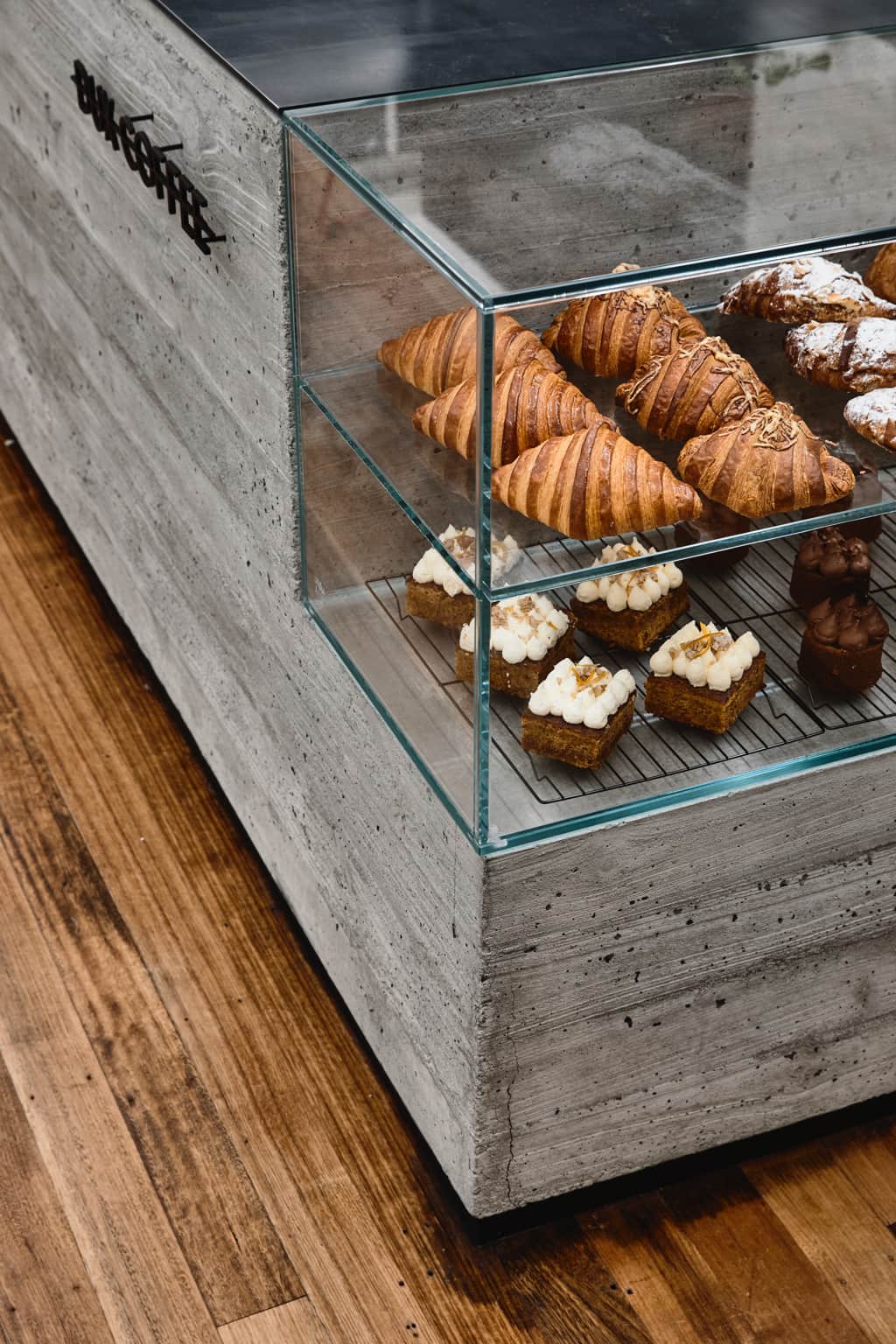 The focal point of the space is the monolithic concrete bar. Apart from hosting the coffee machine with all its accessories, it also incorporates a generous glass pastry display, and sits confidently in front of the bagged brick wall.