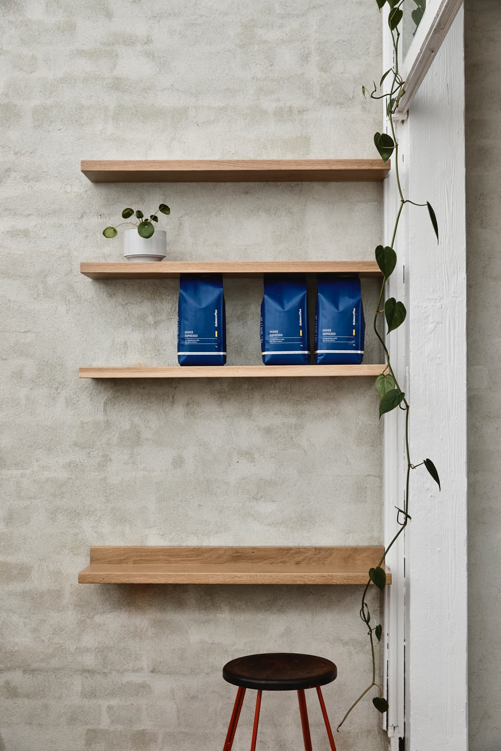The back bar has been kept deliberately subdued, focussing on functionality. A pale grey splashback and shelf blend effortlessly into the brick wall, providing essential display and storage space. Accents of American Oak timber are used as slim waiting tables and additional display opportunities.