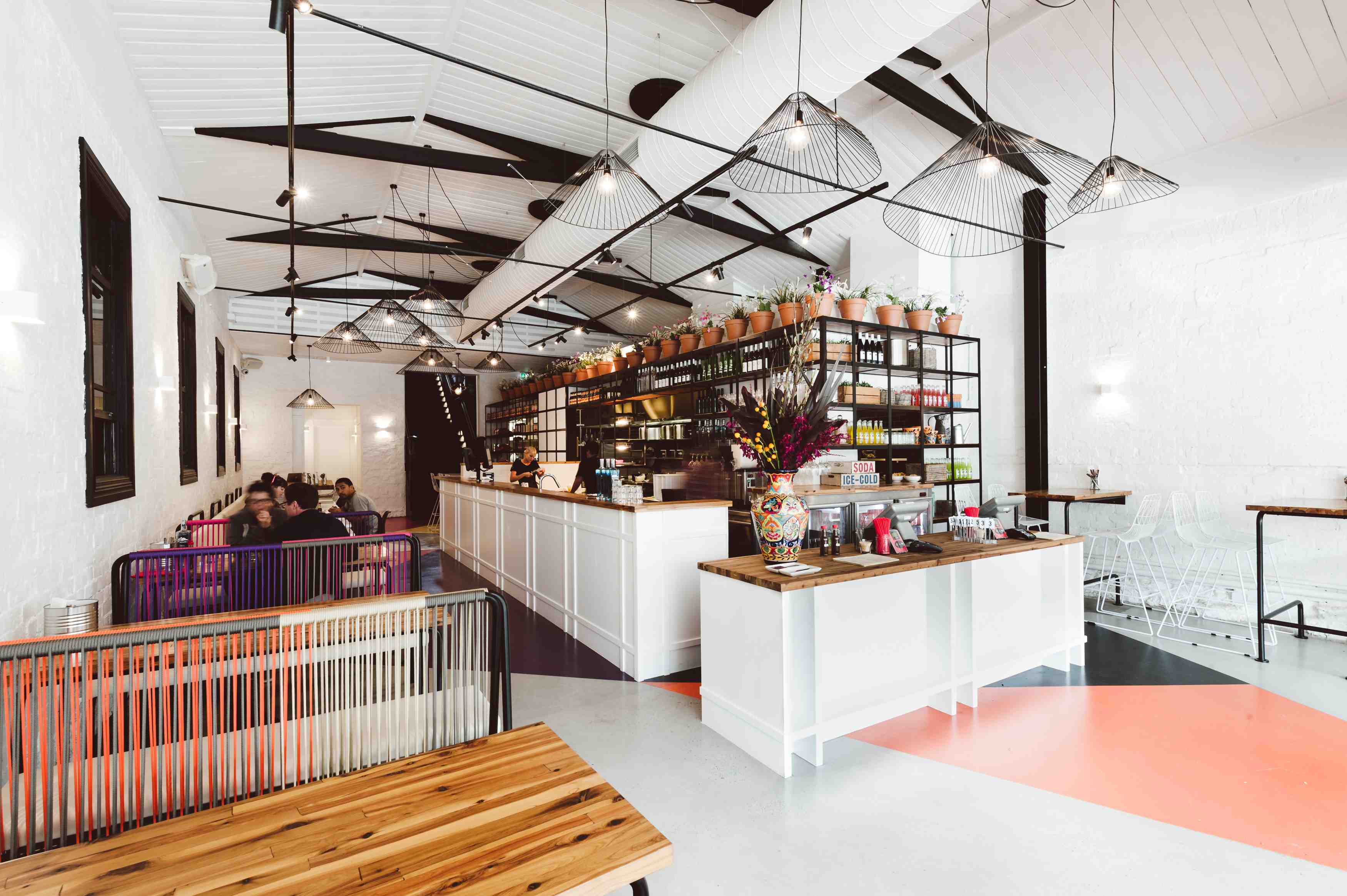 A run-down heritage showroom in Windsor has become the home of the second restaurant under the banner of local taquería Fonda Mexican. The shell of the building was discovered during demolition, and the design was built around highlighting the pre-existing features. This included the cathedral ceiling and trusses, stained glass windows and other period ornamentation. A new insertion conceptualises the kitchen at a more vernacular scale, and is surrounded with custom Techné-designed elements including rope-strung benches that reflect traditional Mexican crafts, and pendant lights based around Acapulco chairs.