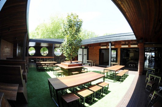 The industrial design includes twin fire places, exposed steel beams, polished concrete and a keg room to view the beer selection on tap – and an outdoor beer garden.