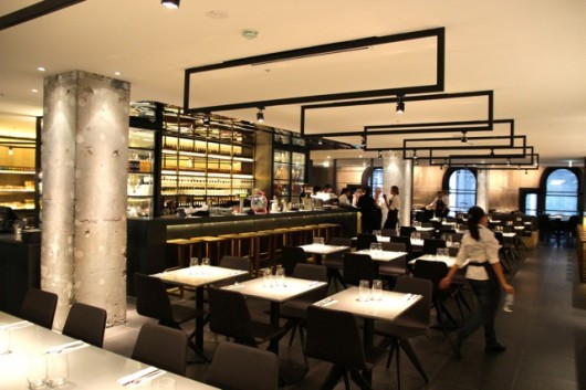 The main feature in the dining area is a heritage sandstone wall, which is strongly lit during daylight hours to draw focus through the restaurant from front to back. White spotlights concealed in a white slot focus pools of light on the dark floor of the dining area, and on the dark tabletops. The materials and lower light levels create a more intimate ambiance.