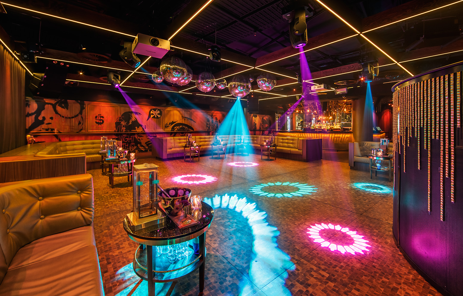 Video wall: 9m x 2.5m main backdrop consisting of 12mm semi-transparent video wall. The wall is hydraulically operated to move the middle 3m section behind the right hand side, by having the right hand side of other wall move forward a few inches. It all aligns perfectly to reveal a 3m section suitable for go-go dancers.
