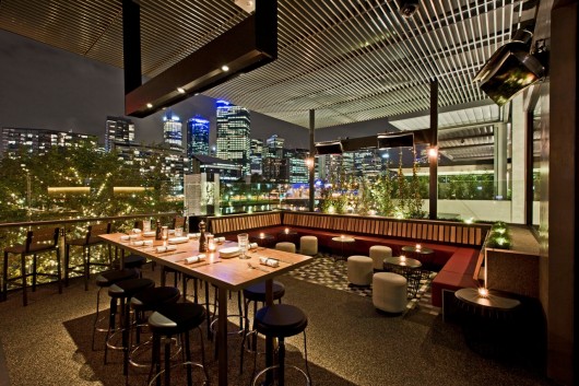 There’s a burger bar downstairs, the ‘Top of the Merrywell’ restaurant upstairs and an outdoor heated terrace overlooking the Yarra river.