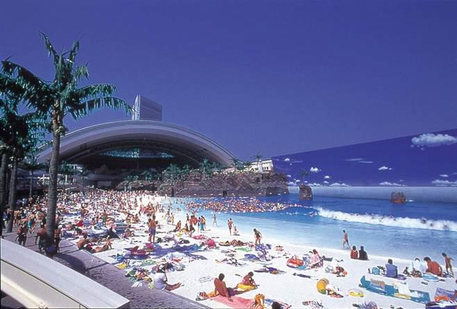 Why build a beach right next to the beach? Get with the program… The weather’s always fine at Ocean Dome; the surf’s always ‘up’ at Ocean Dome; and forget about life-threatening rips, or long slogs through sand fly infested foreshores to find a dodgy loo… and sharks? Well, we’re told the cost of a food is a little steep, but paying over the odds for your sushi platter is a darn sight better than having two white pointers playing tug of war with your limbs.