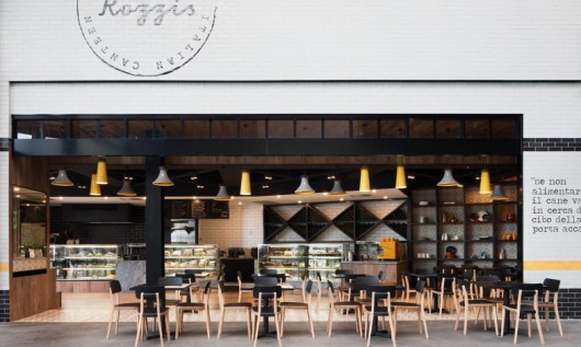 Mim Design’s brief from Rozzi’s was to create an interior that reflected the menu and the modern authentic product used throughout. It was also important that Rozzi’s customers “lived” in the space and took ownership, making it their own kitchen. Timber floors combined with custom detailed concrete tiles work to anchor the venue. The bar, central to the interior, is clad in Atlantic blue granite which offsets the surrounding white glazed bricks and soft black joinery. A series of custom designed pendants, shaped from original Italian wine carafes and oil bottles, line the opening aperture of the venue creating a soft, glowing look. Rozzi’s is a clean and fresh approach to Nonna’s traditional kitchen.