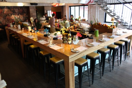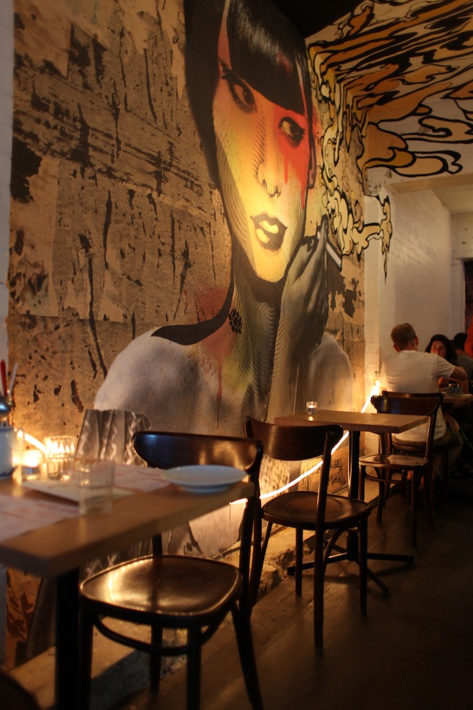 Design features of the venue include a pressed metal bar base and a large crimson and yellow multimedia mural by Michelle Pham. In a nod to sustainability and heritage, all furniture within the restaurant is recycled.
