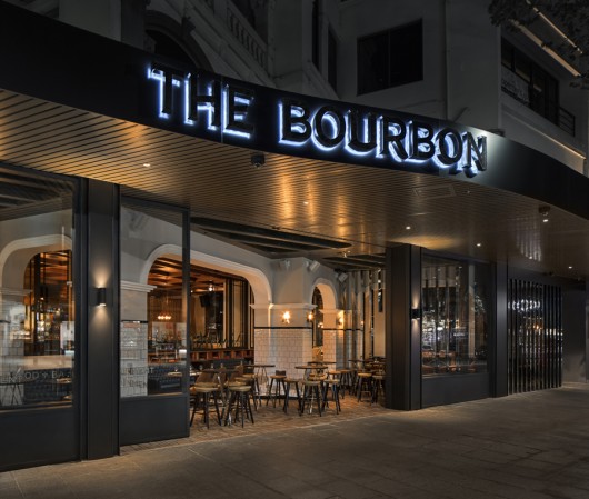 At the Bourbon, the food is showcased via the open kitchen at the entrance, whetting patrons appetites as make their way past before meandering off into the different zones for dining, drinking casually at the bar, listening to music or people watching on the open terrace while being able to move freely between zones and mingle in the process.