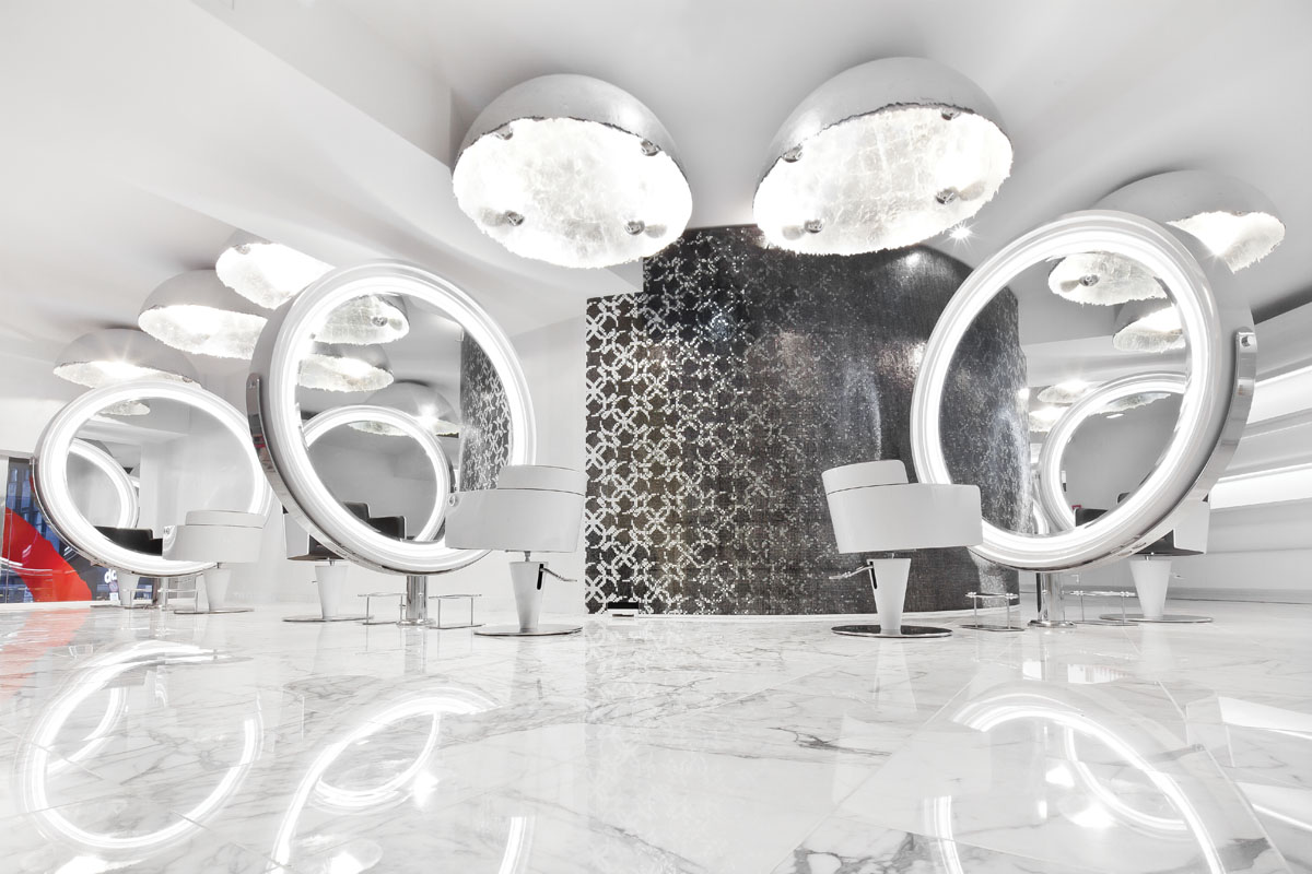 The Aldo Coppola white and red tones merge perfectly into the artistic mosaics that decorate the walls of the salon: the faces of the models who posed for Aldo Coppola-L’Oréal calendars – the beautiful Madalina Ghenea especially – have been perfectly recreated by Trend’s mosaic artists.