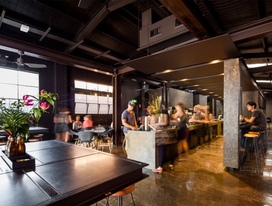 The space, designed by Zwei Interiors Architecture, comprises of two mirror-image warehouse shells. One side houses the primary coffee roaster and coffee outlet, the other the administration, operations and dispatch.