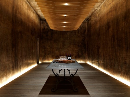 The former concrete winemaking tanks offered a unique opportunity for conversion. The existing wax-sealed concrete tank walls, with their wine stained patina, were retained and highlighted. The result is a reflective, inward focused space disconnected from the outside world, where attention is concentrated on wine, food and fellowship.